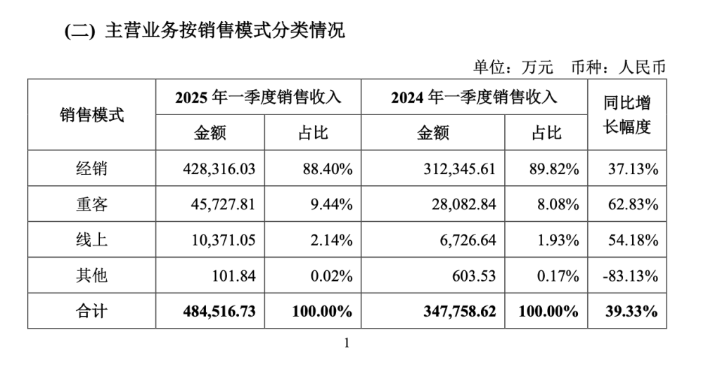渠道方面,经销模式占比仍近九成,占比同比下滑1.42个百分点。线上占比从去年一季度的1.93%增至2.14%。
