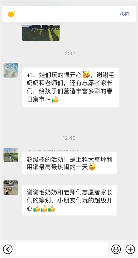 4月15日 志愿者家长、提供物质与带宠物的家长一大早就与老师一起搭建布展环境。托小班家长自驾车,中大班孩子到校乘大巴车到上海科技大学大草坪集合,"上海科技大学附属民办幼儿园春日嘉年华"完美开幕,圆满结束。