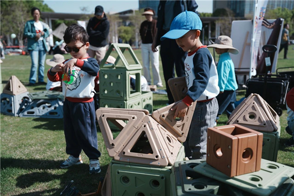 十重"童趣秘境"让孩子们乐此不疲——九宫格足球划出彩虹弧线,小小少年们用脚尖叩响春日的门环;滑草拖车载着欢叫俯冲,全家共享天伦之乐,陪伴是最长情的告别。充气鱼池也是孩子们的最爱,一根钓杆、一尾小鱼,孩子们徘徊池边,静候那抹跃动的身影——我的小小战利品;夹弹珠比赛一轮接一轮,孩子们运用筷子的能力出神入化、炉火纯青。机灵的"小地鼠"探出脑袋偷尝春光,转眼又被木槌敲成俏皮的音符。小顽童们眼巴巴排队等在套圈圈,心里默念咒语"圈圈你要听话哦,让我套住它!"最是风筝扶摇处,恰似春天里肆意奔跑的快乐心情!