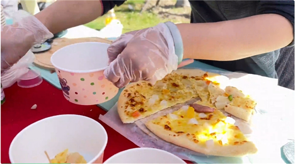 今天美食街的每个摊位都是味觉的魔法阵。印度飞饼师指尖旋舞,面饼如银月凌空翻转,裹住水果的甜与面团的柔,好手艺啊!两小时中完成了70多个印度飞饼。印度师傅说:"如果我天天有这么好的生意,一定会发财。"