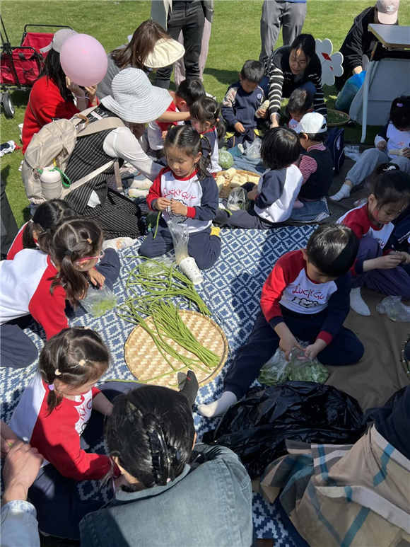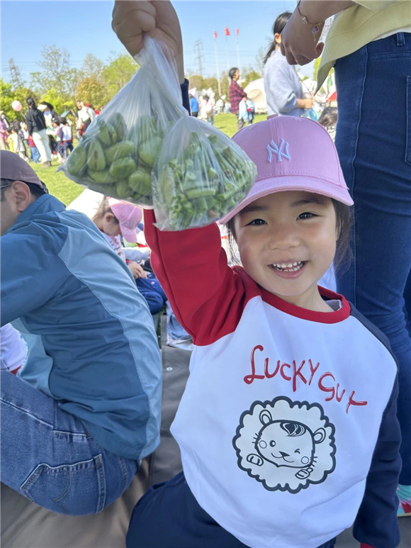 春日时令手工坊内人头涌动,鲜嫩的时令蔬菜让孩子爱不释手。剥开翡翠般的蚕豆荚,粒粒珠玉滚落掌心;摘下弯月似的长缸豆,藤蔓还沾着晨露的微光;嫩绿草头在手指尖舒展清香,玉米苞叶裹着甜糯的秘密。