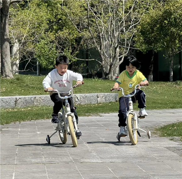 春日暖阳将金粉筛落在蜿蜒的骑行道,春风掠过新芽时哼起清脆的歌谣。一群小小孩骑车而来,车轮碾过斑驳树影,且任春风托起衣角,让车铃撞碎满径春光——此刻的骑行路,分明是大地铺展的五线谱,每个孩子都是跳动的音符。