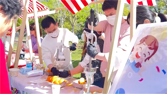 爆米花机"嘭、嘭"炸开一个个"云朵",焦糖雨簌簌落在纸筒;1000多个茶叶鹌鹑蛋填不满孩子们的小嘴;橙子在榨汁机里碎成橙光,400多只橙子让志愿者家长抬不起胳膊,好吧,年富力强的傅老师顶上来,一个接一个,一杯连一杯,孩子在香甜的春日特饮里,品尝着春天的滋味。