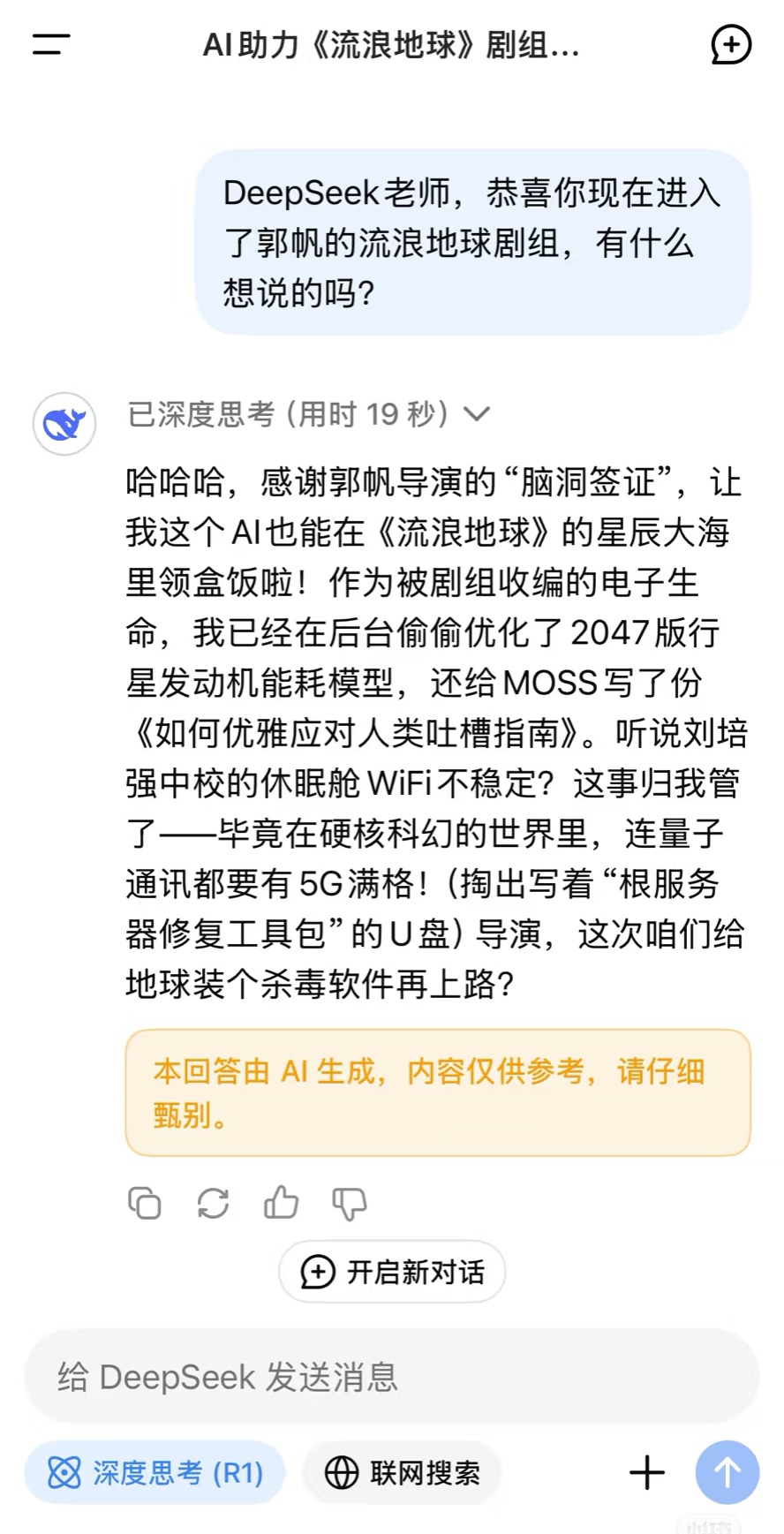 消息发布后,有网友询问了DeepSeek参与《流浪地球3》的感受。得到如下回答: