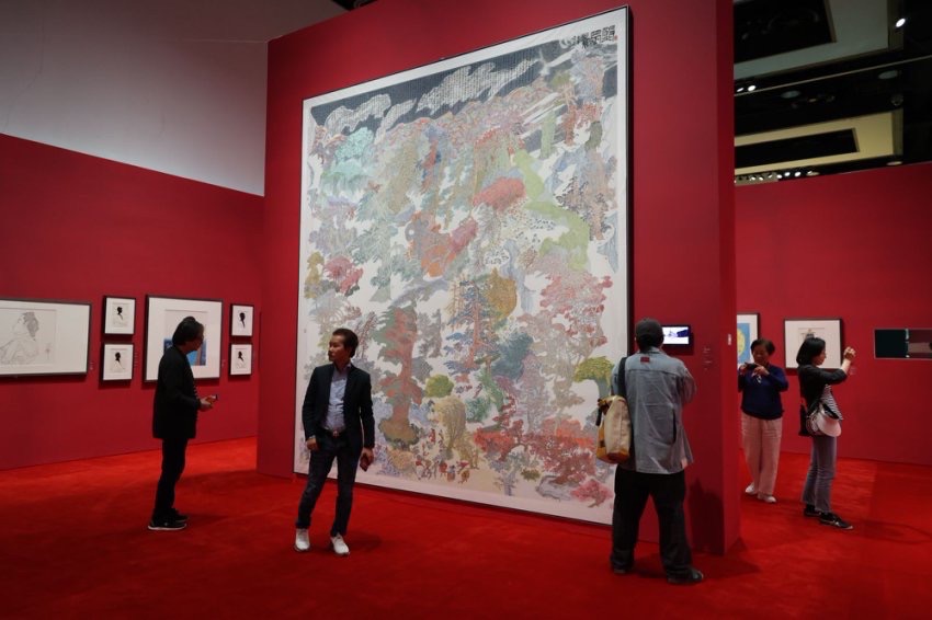 在展厅另一侧,4月14日开箱的《踱步》《开路先锋》《山地风》三件重磅展品已经上墙。其中,《开路先锋》以其高近2米、宽4.45米的宏大尺幅,借展自中华艺术宫,展现出顶天立地的磅礴气势,充满了浪漫主义色彩。这是陈逸飞艺术生涯早期的重要作品,由他与魏景山合作创作而成。1971年,二人深入南京梅山铁矿实地考察,绘制了大量手稿。他们被工人阶级的力量与精神深深鼓舞,精心选取工人抬钢轨昂首前行的场景作为画面主体。作品采用仰视视角,生动展现出开路先锋的豪迈气概与蓬勃的生命激情。当时参与创作的陈逸飞年仅26岁,而这件作品一经问世,便在中国美术界引起了广泛关注。 据了解,本次展览不仅仅是陈逸飞绘画作品,还将囊括雕塑、影像、出版物、手稿等多种媒介,覆盖了他各个时期内风格多样的不同系列创作,展品总数量将超150件。 “老顽童”黄永玉晚年力作 “上海过去是冒险家的乐园,如今是艺术家的摇篮——谁不信?我揍他!”一走进位于世博会博物馆展厅,就与老顽童黄永玉的诙谐宣言撞个满怀。这位才华横溢的艺术大师,直到99岁还在创作。“如此漫长·如此浓郁——黄永玉新作展”便是集中展示了黄永玉90岁后创作的彩墨、版画、雕塑等200余件作品,呈现其晚年艺术突破与生命哲思。