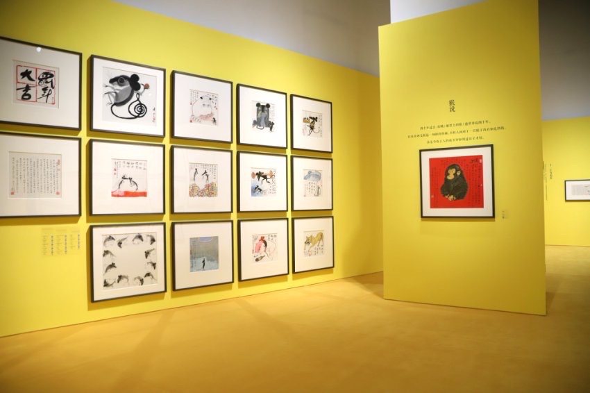 1980年,中国邮政发行了第一枚生肖邮票——《庚申年》金猴邮票,而其设计者正是黄永玉先生。这套邮票至今仍是集邮爱好者心中的“至宝”。展览中特别设立了“生肖说”板块,鼠年月历、兔年月历、虎年月历……这些熟悉的形象跃然纸上,灵动可爱:小鼠与小猫饮酒大醉,老虎站立高歌,黄牛大口咀嚼牡丹,兔子遥立于月亮之上……每一幅生肖画都蕴含着一个个寓言般的深刻道理。 画作《猴说》旁写着黄永玉的话:此猴原是广州朋友所赠,取名“依哦”。不料邮票一出,替国家赚了大钱,这是我和依哦原先想不到的。四十年过去,依哦逝世亦近四十年。日来市场又掀起一场新的热闹,不料人间对于一只猴子尚有如此热情,真是令作主人的我不知如何过日子才好。