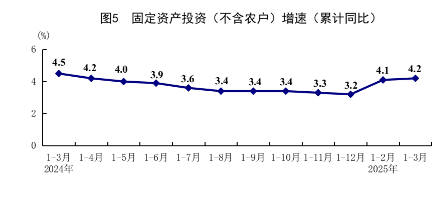 一季度,全国固定资产投资(不含农户)103174亿元,同比增长4.2%,比上年全年加快1.0个百分点;扣除房地产开发投资,全国固定资产投资增长8.3%。从环比看,3月份固定资产投资(不含农户)增长0.15%。
