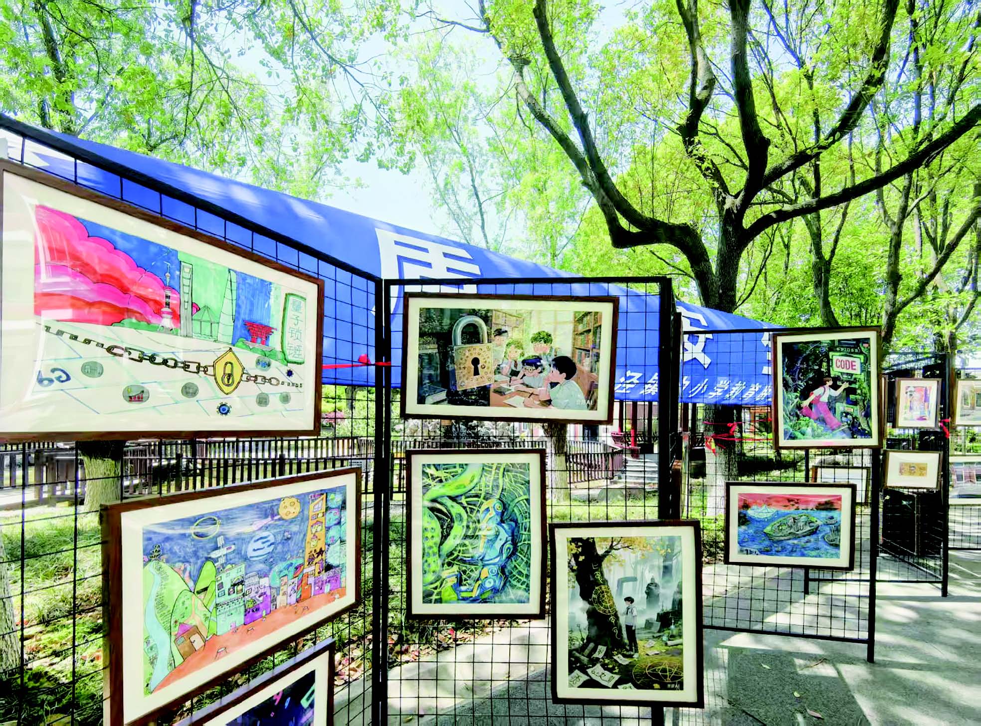 一场融入密码科技元素与AI数字创作手法的“密码艺术展”也在林荫大道上展出,色彩绚丽的绘画作品与灵巧的密码文创作品设计稿吸引了众多目光。这些作品的创作者既有初高中生,也有小学生。据介绍,为期半个月的艺术展作品征集时间里,共收到各类作品200多份,密码安全的重要性借由作品得到了艺术化的呈现。活动为优秀创作者颁发了荣誉证书。