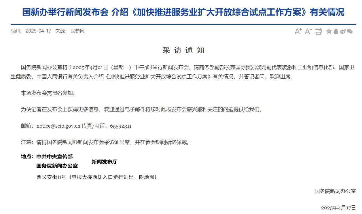 国新办将举行发布会,介绍《加快推进服务业扩大开放综合试点工作方案》有关情况