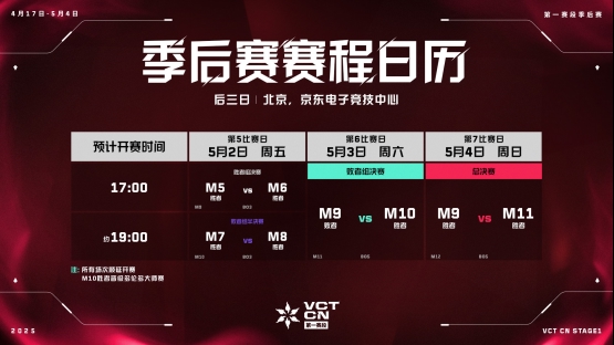5月2日至5月4日,四支队伍将前往位于北京的京东电子竞技中心,决出第一赛段冠军。5月2日将进行胜者组决赛、败者组半决赛,其中败者组半决赛将决出第三个晋级无畏契约多伦多大师赛的名额;5月3日将进行BO5败者组决赛。5月4日,VCT CN联赛第一赛段总决赛将打响,两支队伍将展开最后的BO5对决,胜者会成为总冠军,并以一号种子的身份出征将于2025年6月举办的无畏契约多伦多大师赛。
