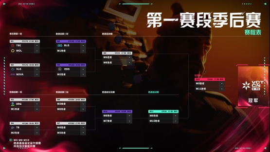 VCT CN联赛第一赛段季后赛将分为两个阶段。4月17日至4月20日,季后赛前四日,八支队伍将来到位于上海的无畏竞技场展开较量,决出四支进入下一阶段比赛的队伍。其中4月19日胜者组第二轮的两场比赛,获胜队伍将分别获得多伦多大师赛的晋级席位。