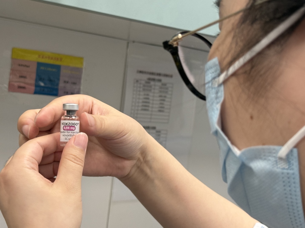 4月17日,在国家药品监督管理局和上海市药品监督管理局的支持下,新华医院护士为4岁软骨发育不全患儿曦曦(化名)注射了国内首例通过特殊进口通道获批的靶向药物伏索利肽。目前,曦曦需要每日注射一次药物,并定期监测生长发育及肝肾功能。
