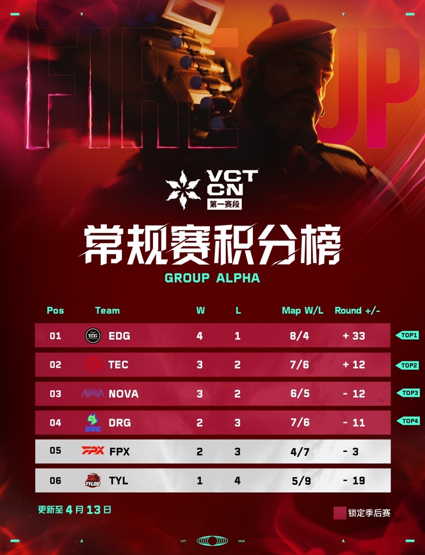 东方网4月17日消息,历经五周的精彩比拼,2025 VCT CN联赛第一赛段常规赛阶段的比赛已经全部结束,第一赛段季后赛的争夺即将分两地上演。 4月17日至4月20日季后赛前四日,八支晋级队伍将继续在位于上海的无畏竞技场展开较量,决出四支队伍进入季后赛后三日的比赛。季后赛后三日(5月2日至5月4日),VCT CN联赛将首次来到北方,四支队伍将前往位于北京的京东电子竞技中心决出最后一个晋级多伦多大师赛的席位,以及VCT CN联赛第一赛段的冠军! 常规赛八支队伍突出重围,季后赛京沪两城蓄势待发 经过常规赛的激烈比拼,BLG、NOVA、XLG、TE、WOL、EDG、TEC、DRG八支队伍突出重围,常规赛排名小组第一的两支队伍ALPHA小组EDG、OMEGA小组BLG将直接进入季后赛胜者组第二轮,而各小组第四名则需从败者组第一轮开始力争上游。