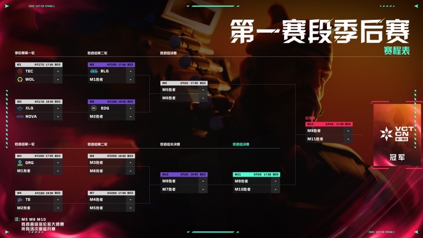 本次VCT CN联赛第一赛段季后赛将分为两个阶段。4月17日至4月20日的季后赛前四日,八支队伍将来到位于上海的无畏竞技场展开较量,决出四支进入5月2日至5月4日的季后赛后三日比赛的队伍。其中4月19日胜者组第二轮的两场比赛,获胜队伍将分别获得多伦多大师赛的晋级席位。 5月2日至5月4日季后赛后三日,VCT CN联赛首次前往北方,四支队伍将在位于北京的京东电子竞技中心。5月2日将进行胜者组决赛、败者组半决赛,其中败者组半决赛将决出第三个晋级无畏契约多伦多大师赛的名额;5月3日将进行BO5败者组决赛;5月4日将进行总决赛,并决出2025 VCT CN联赛第一赛段冠军。