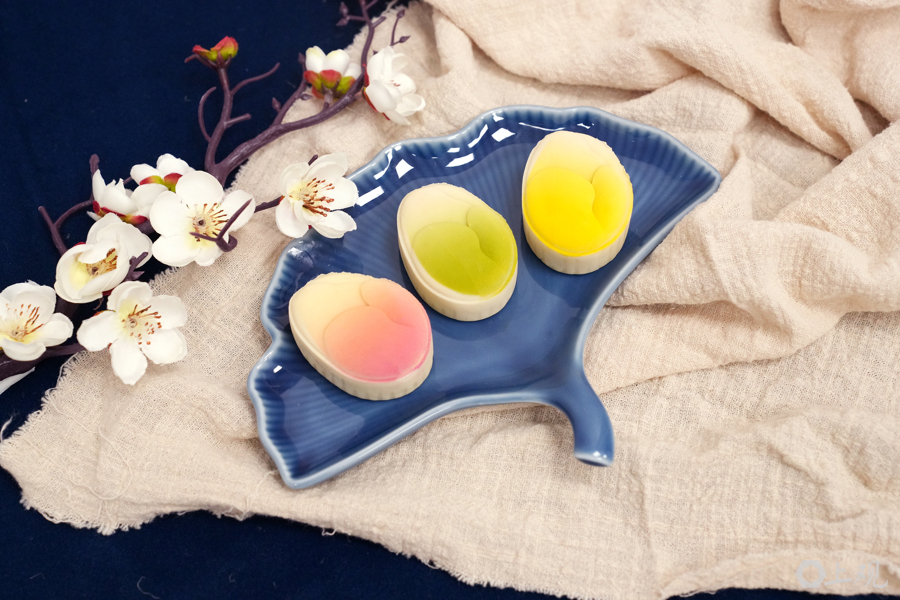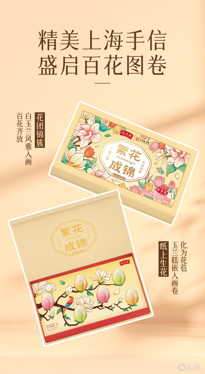 礼盒上,白玉兰摇曳生姿,其他花卉衬托在旁,绘制成一幅百花图卷。打开礼盒,一幅玉兰枝头的画卷映入眼帘,6枚白玉兰型茶点嵌入在画卷中,幻化作枝头饱满欲坠的“花苞”,极其雅致。糕点的制作沿用了沈大成传承百年的非遗点心技艺,并根据上海国际花展的主题推陈出新,特别定制了三款口味的花茶风味糕点:玫瑰色花型,是经典的金沙口味,再添一份玫瑰芳香;淡绿色花型,让茉莉香邂逅龙井绿,自显一派轻灵淡雅;淡黄色花型,在醇厚的乌龙茶香上融入金桂,更具馥郁之感。