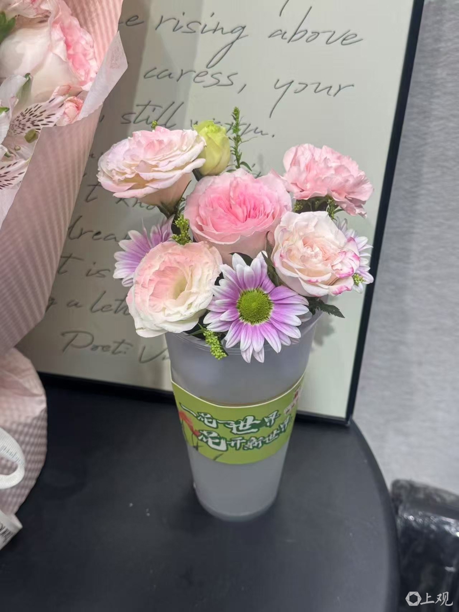 泰康食品新推出的“花顶奶茶”,最近成了南京路步行街上的网红打卡爆款。一个硕大的奶茶杯子上,一簇五颜六色的鲜花,“好口味+好颜值”,吸引了不少消费者购买。