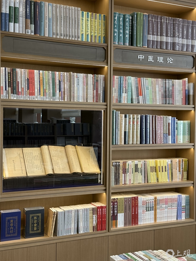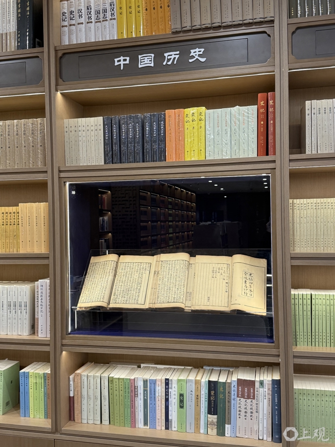 分布于书店不同楼层的三个“古今对照”橱窗正是“对话感”的一个写照。三个橱窗分别为文学、历史、中医主题,文学橱窗陈列明嘉靖十五年玉几山人刻本《集千家注杜工部诗集》二十卷;历史橱窗的清光绪四年金陵书局翻刻汲古阁本《史记》一百三十卷上方,正是《史记》现代出版物的不同版本;中医主题为上海古籍书店特色,在种类繁多的中医类图书之中的中医橱窗里,目前展陈着明崇祯间抄本《重广补注黄帝内经素问》二十四卷,开业后,三个“古今对照”橱窗里的古籍将不定期更换。