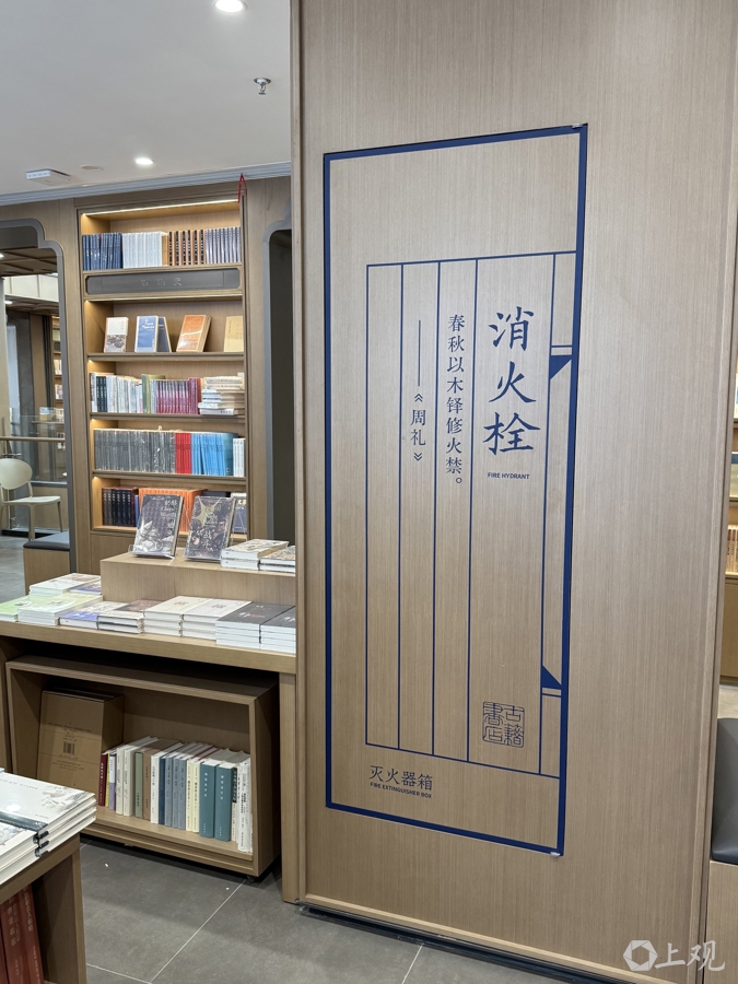 “古籍”的趣味藏在细节里。比如一楼服务台的形态,被设计成了古籍残卷的样子,这残卷可以在古籍书店的库房里找到。书架间偶遇一个木箱体,箱门背后是消防设备,箱体上印着“春秋以木铎修火禁——《周礼》”,顿时让灭火器箱有了古意。