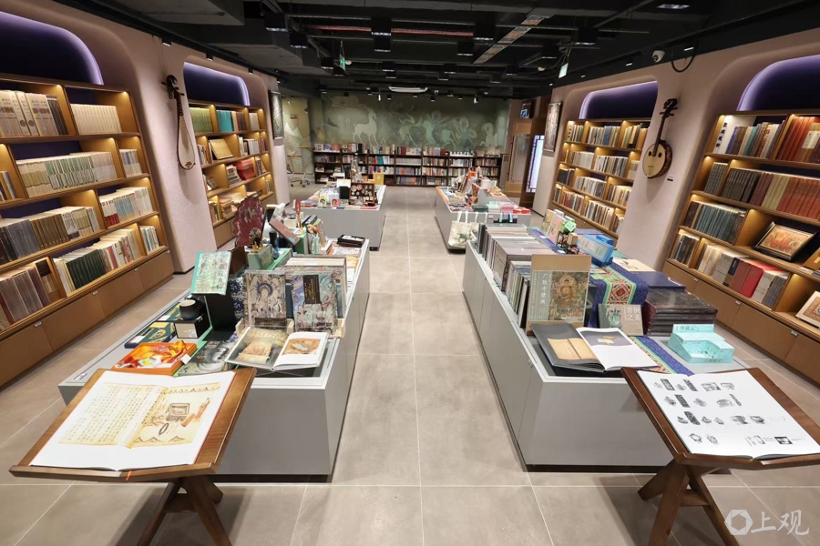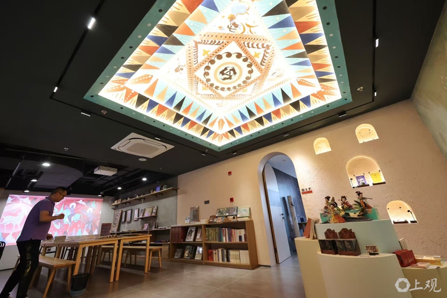 四楼“敦煌空间”汇集敦煌图书、服饰、乐器、文创等,让读者感受中华文明交融。施晨露摄