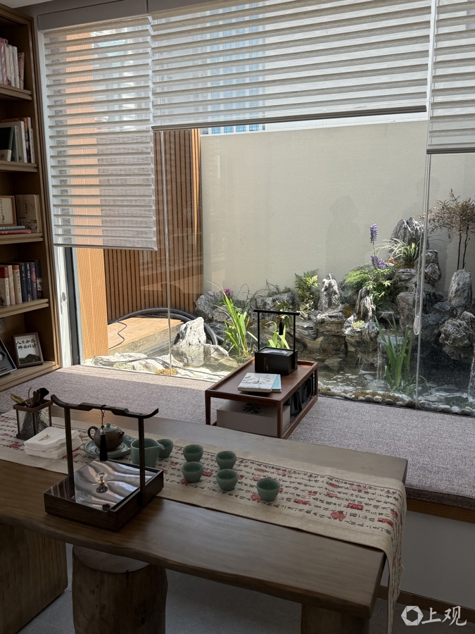 中庭左侧,一方开阔的“四时雅韵”特色空间是书店对外展示的窗口之一,读者可以通过琴棋书画、诗香花茶、鸟木虫鱼、时令节气等不同主题陈列的时时变换,走进古人的生活。透过落地玻璃窗,“古人生活”与现代街景交织,向路人发出召唤——进来看看。