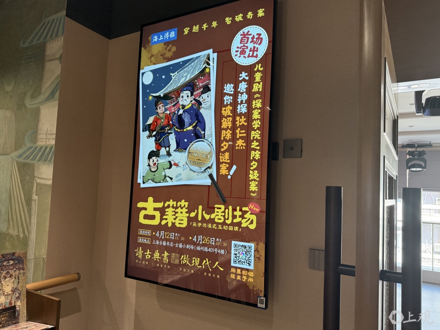 本周六(4月19日),上海古籍书店将正式揭开改造后的面纱。4月12日,福州路上的这家老牌书店为一群孩子率先开了门。孩子们走进位于书店四楼的“古籍小剧场”,观看了一出根据《大唐狄公案》改编的沉浸式互动阅读儿童剧《探案学院-除夕疑案》。
