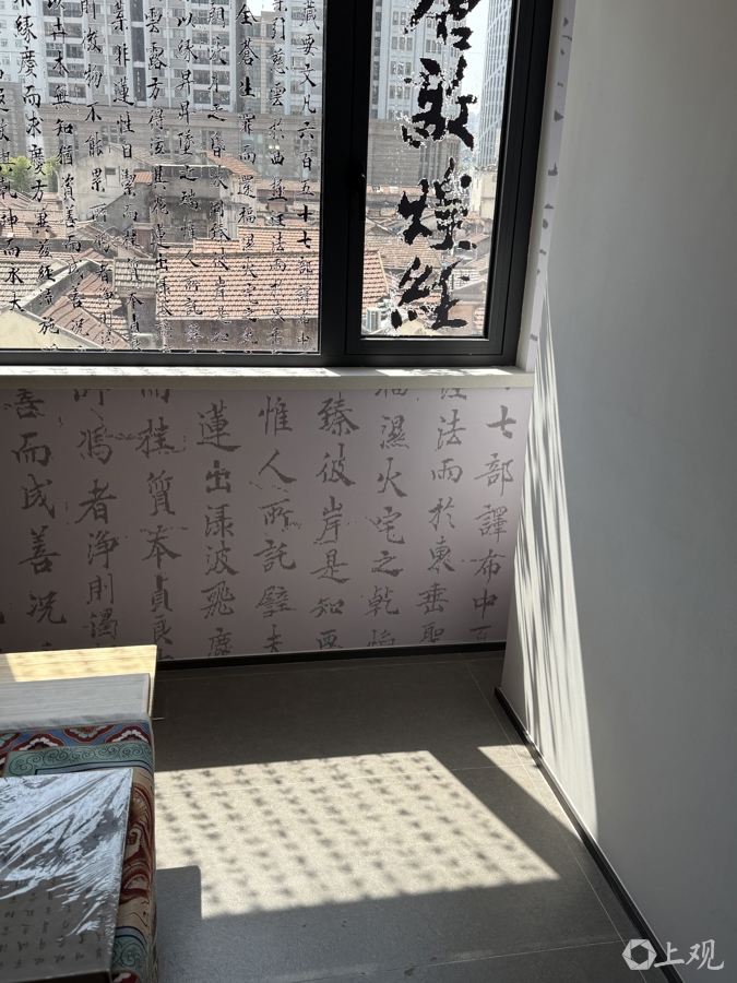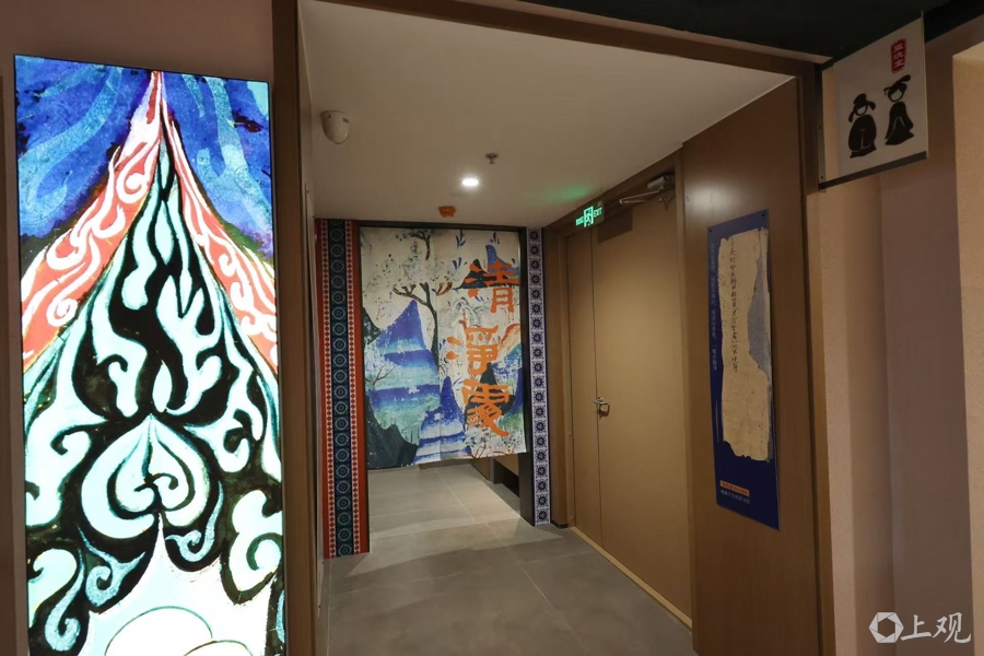 特色空间“藏经洞”里,随着光线移动,窗上文字的投影构成一幅流动的文献图卷。施晨露摄