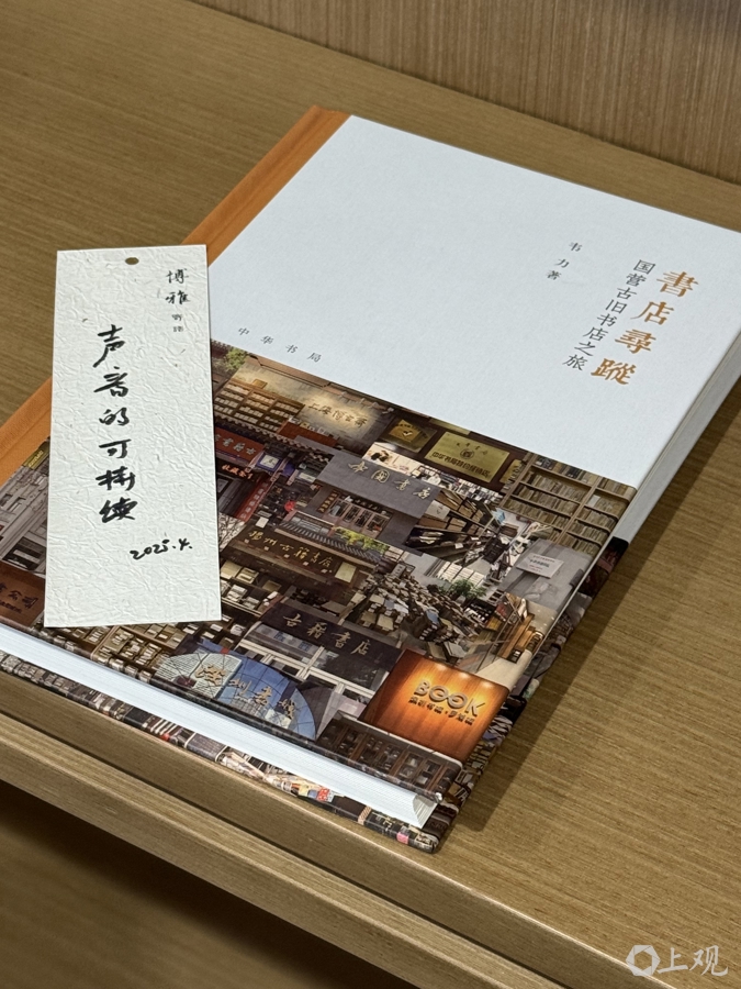 古籍书店一楼,在陪伴书店十八载的孔子像背后,记者发现了一方特别的书架,和已经摆得满满当当的其他书架相比,这里显得“虚席以待”。书架上方书写着“博雅”二字,探店当天,顶层和二层格子里放置着十来本书。抽出一本《书店寻踪——国营古旧书店之旅》,夹着的书签上有手写字“声音的可持续”,落款2025年4月。