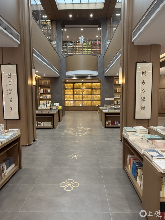 步入书店,第一感觉确乎“焕然一新”。沿着地面上的传统纹样柿蒂纹前行,仿佛走进了古人的“藏书楼”,中庭挑空的设计别有意趣,给人“你站在桥上看风景,看风景的人在楼上看你”之感。迎面所见两根立柱上为原上海图书馆馆长、版本目录学家顾廷龙先生的题字——“藏古今学术,聚天地菁华”,与“藏书楼”意境契合。