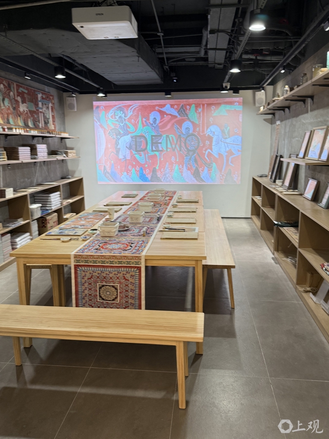 四楼的“敦煌空间”是孩子们的天地,“古籍小剧场”就位于此。沿三楼至四楼楼梯处的沙漠造景,让书店风格一变,在融合《鹿王本生图》、“三兔共耳”“舞乐飞天”元素的手绘洞窟壁画和藻井等视觉艺术烘托下,好像一路沿着河西走廊,走进神秘瑰丽的大漠敦煌。在数字动画互动展区,既能观赏动画投影《鹿王本生图》,也能开展研学活动。