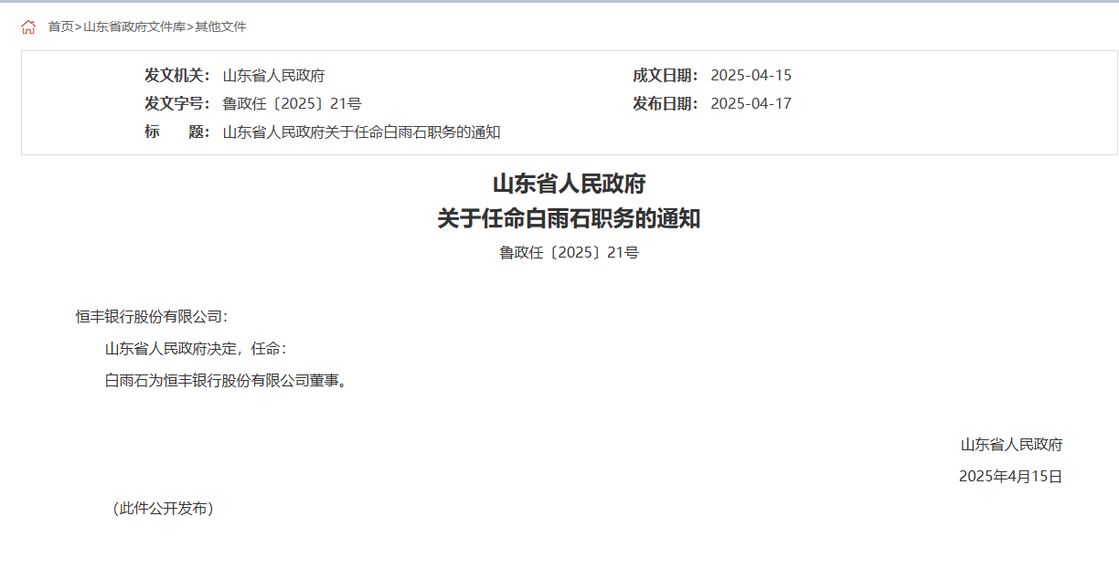 此前3月21日,山东省委组织部发布干部任前公示公告,现任恒丰银行股份有限公司党委委员、副行长白雨石,拟任省管企业正职,公示期限至2025年3月28日。
