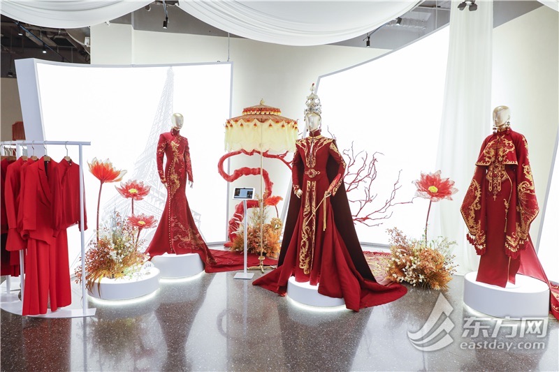 尚街新中式旗舰店坐落于嘉善路,大红色的门楣独具中式风情。以“四季”为灵感的“花信”高定主题展带来30余套秀场高定作品、逾300件成衣,呈现一场跨越时空、融通古今的东方时尚对话。以《千里江山图》为灵感的夏季高定名为“江山舞”,衣袂上流动的青绿山水仿佛一阵清风拂面。秋季高定款则借来敦煌壁画一缕神韵,佛龛、莲花、宝相花错落有致。除了秀场高定作品,店里还有更适合日常穿着的新中式服装,开业当天就迎来了不少消费者选购。