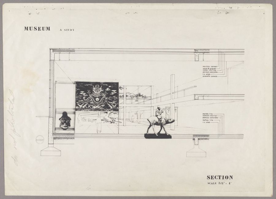 贝聿铭,《哈佛大学设计学院建筑硕士论文中“上海中华艺术博物馆”设计的剖面绘图》,1946年。由哈佛大学设计学院弗朗西斯·洛布图书馆提供。