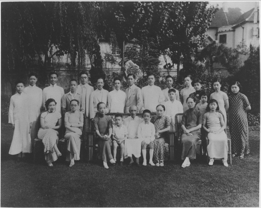 贝氏家族于上海福开森路(现武康路)贝祖诒住宅(属中国银行所有)的花园中合照,后排:贝聿铭(左三)、贝祖诒(左六),坐者:贝聿铭祖父贝理泰(左五),1935年。©版权所有,由贝洽提供