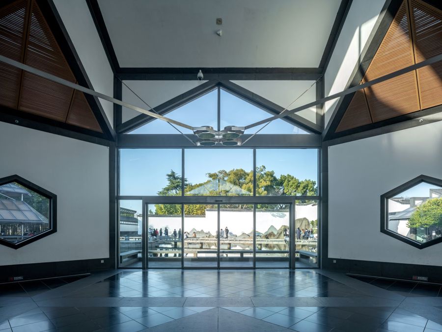 苏州博物馆(2000–2006)大厅框起了花园中的石景等主要景观,苏州,2021年。摄影:田方方。M+委约拍摄,2021年。© 田方方