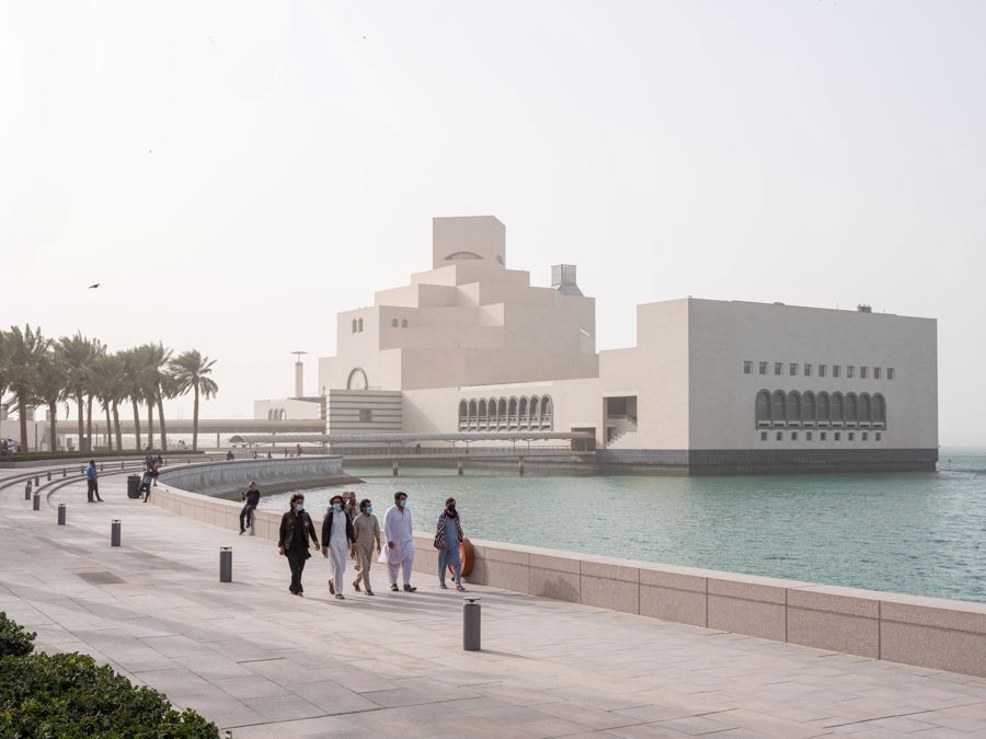 从公共海滨长廊望向伊斯兰艺术博物馆(2000–2008),多哈,2021年。摄影:穆罕默德·萨姆吉。M+委约拍摄,2021年。© Mohamed Somji