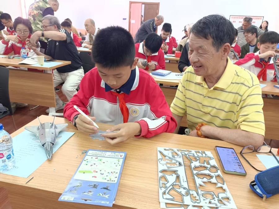 活动中,“老少同心”军舰模型搭建点燃青少年的海洋崇军热情。退役老兵与同学们共同协作,拼装“辽宁舰”、歼-20等航母飞机模型,从龙骨组装到舰载机定位,细节中传递着对海洋强国的憧憬。