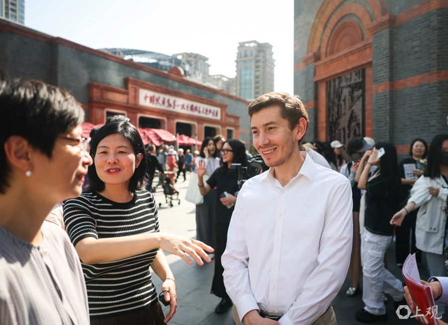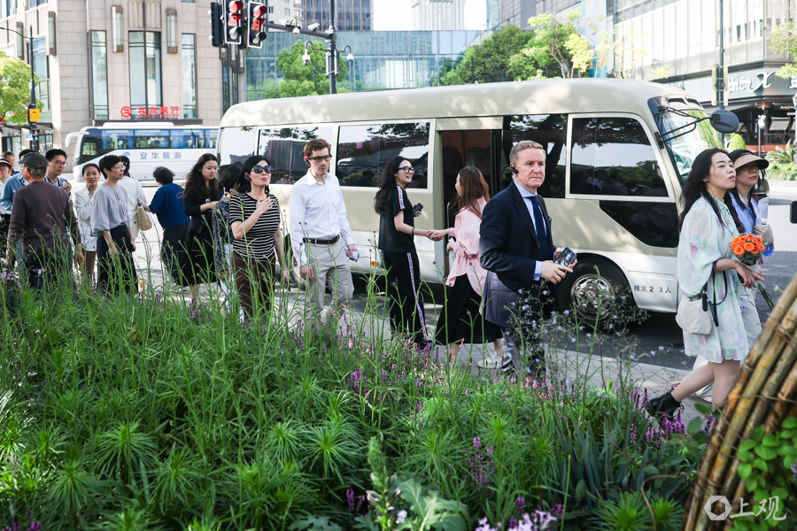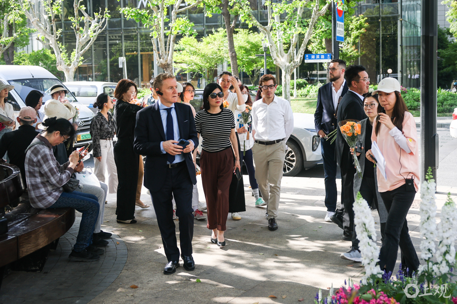 外籍高管在街道负责人与营商服务团队的陪同下,一路走、一路看,漫步于浪漫的城市公园中,沉浸式感受花展的魅力与新天地的活力。