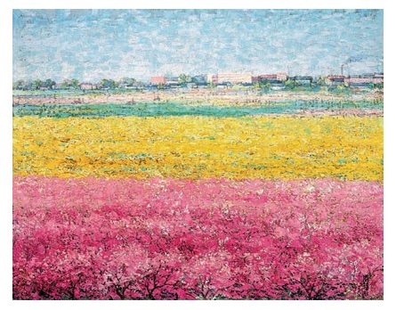 周碧初也创作了大量描绘上海风光、反映上海社会主义建设发展和生活场景的作品,成为上海城市珍贵的艺术记忆。此次展出的描绘上海近郊风光的《春色》,便是其中的代表作。画作中,他把玫瑰红的桃花、柠檬黄的菜花、粉绿的麦苗以及远处的厂房和住宅有节奏地组成宽狭不等的平行色块,远远看去,仿佛一道道彩虹。为了避免因色彩鲜艳而导致流俗,艺术家采用油画刀而非油画笔创作。用刀作画留下的生涩感和粗犷气息,使得画面显现出极强的质感与力度,整体上构成一种既恢宏、高亢,又拙朴、深沉的独特美感。作品创作于上世纪60年代,但在今天看来依旧先锋。