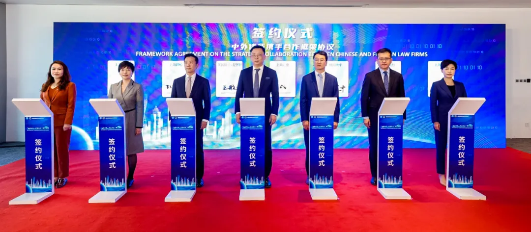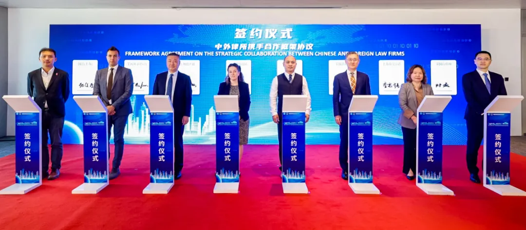 中外律所携手合作签约仪式,多家中外律所代表处聚焦跨境投资合规、国际仲裁等领域,达成战略合作,探索联合服务机制。