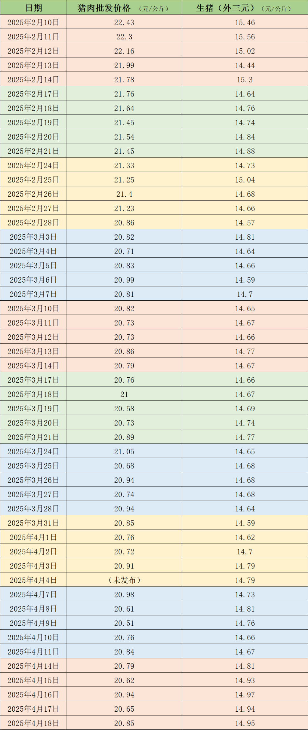 据农业农村部监测,4月18日,全国农产品批发市场猪肉平均价格为20.85元/公斤,与上周五(4月11日)的20.84元/公斤相比,基本持平。本周的平均价格为20.77元/公斤,与上周20.74元/公斤的均价相比,上涨0.1%。