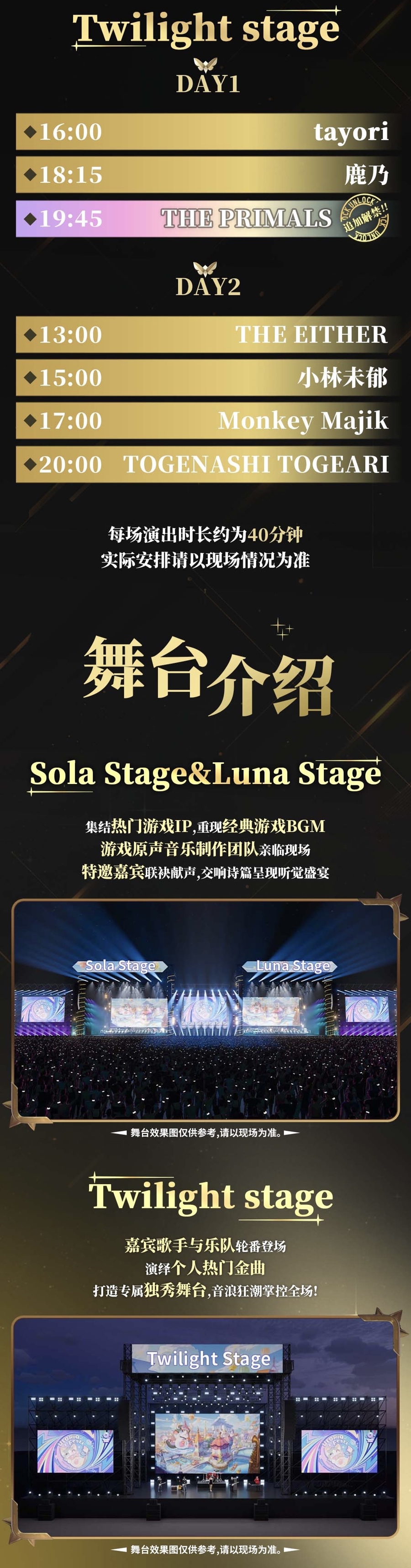 除了IP舞台外,UF游戏音乐嘉年华还特别增设了属于嘉宾自己的舞台,演绎个人及乐队的热门金曲。演出嘉宾有与原创动画《少女乐队的呐喊》联动的真人乐队的TOGENASHI TOGEARI,以《最终幻想14》音乐总监祖坚正庆为核心组建的游戏音乐组合The Primals,将迎来首次海外线下演出的新生日本创作组合tayori,还有“拔剑神曲”原唱、实力派歌姬小林未郁等多位重磅嘉宾。
