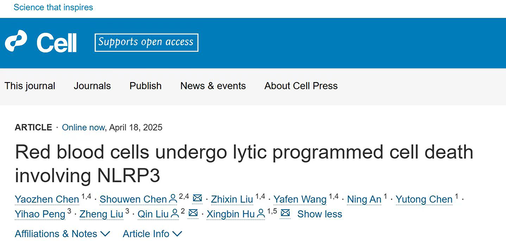 针对这一问题,华东理工大学教授刘琴团队联合空军军医大学附属西京医院副教授胡兴斌团队,揭示了一种红细胞程序性死亡的新机制。北京时间4月18日,国际期刊Cell(《细胞》)以“Red blood cells undergo lytic programmed cell death involving NLRP3”为题,发表了这一研究成果。