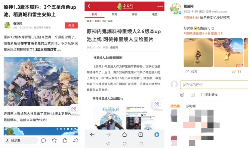 图说:某网站及其关联自媒体矩阵账号发布的《原神》涉密游戏内容