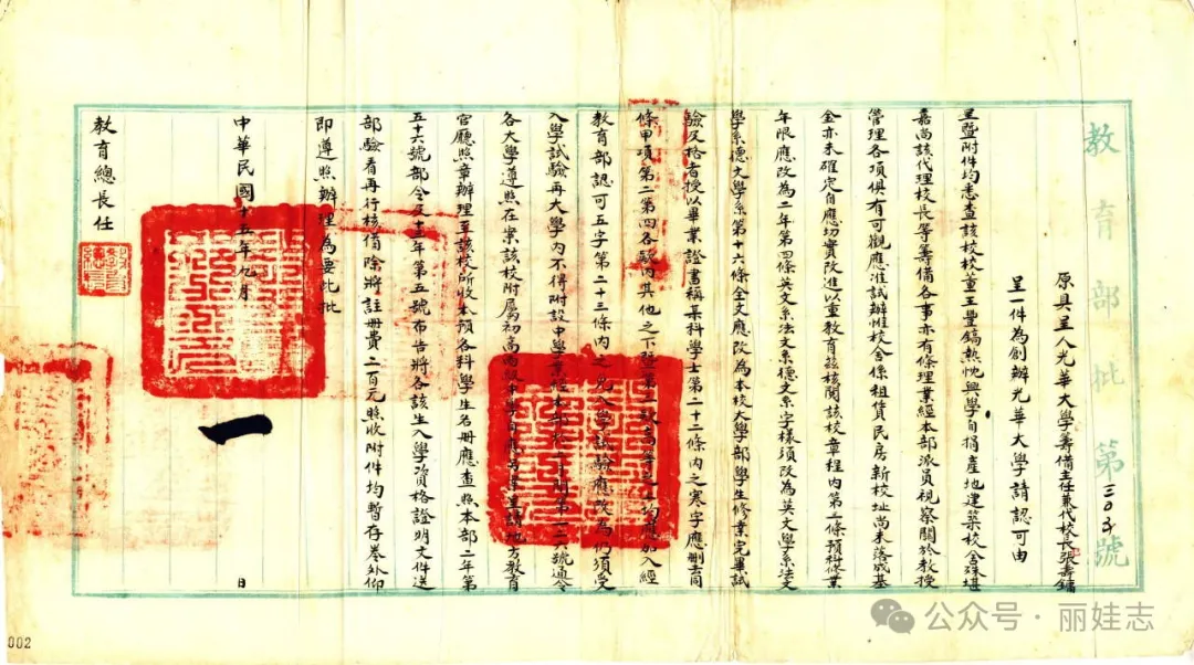 1926年9月,民国北京政府教育部同意光华大学试办的批文。