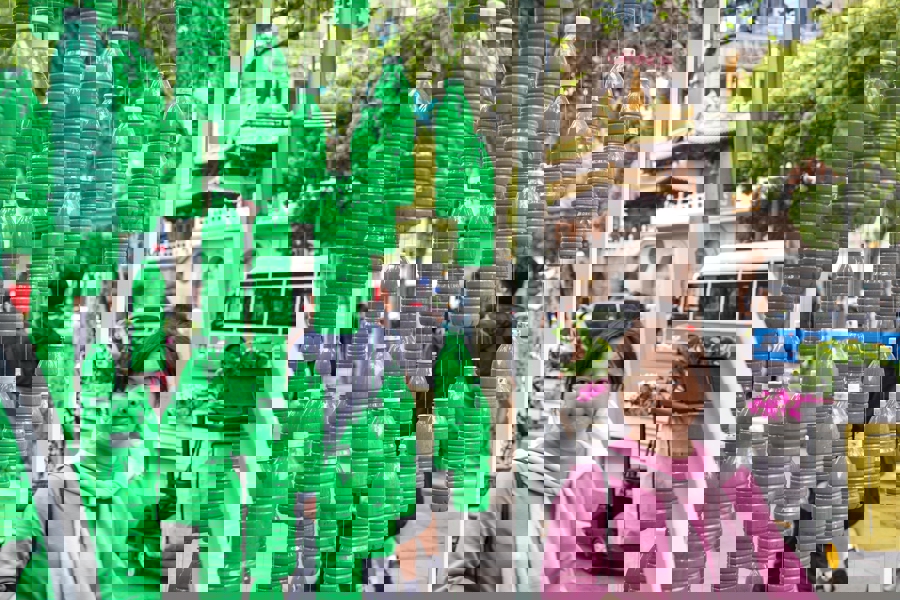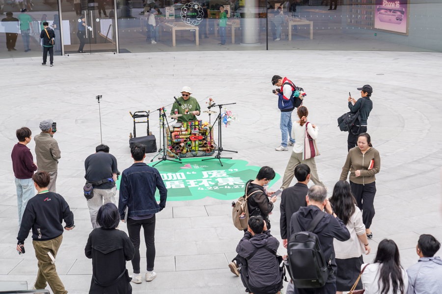 活动从22日持续至27日,同时开设美陈打卡区域、互动体验区域及市集区域等部分,主题围绕“一件小事爱地球”进行开展,现场设置专门区域,将收集来的塑料瓶进行分类、清洗,再通过创意改造,制作成精美的装饰品、实用的小物件,真正实现回收再利用,契合地球日的环保主题。活动首日,手作乐器表演者跳中跳携回收材料自制的打击乐器为现场市民游客带来了一场别开生面的视听体验。