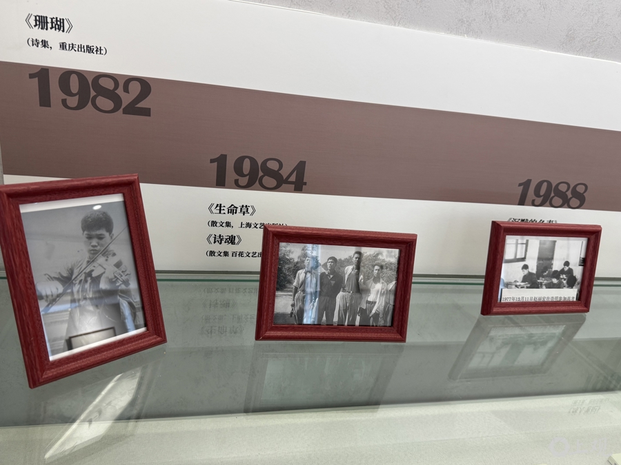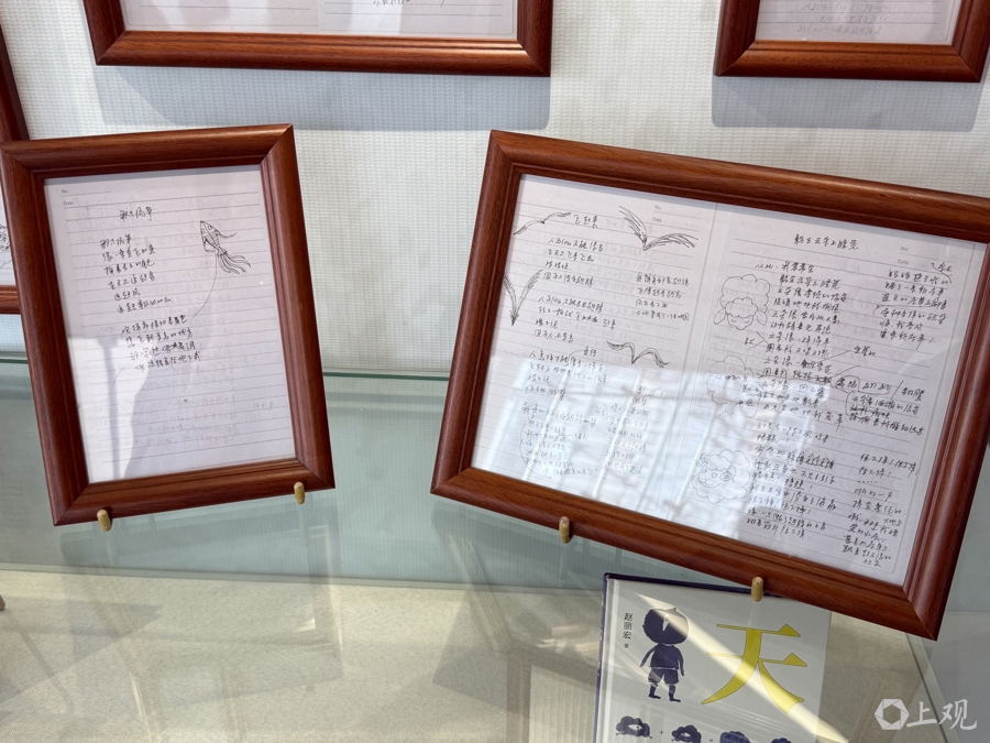 正在静安区档案馆举行的“赵丽宏的文学世界”正是这个读书人内心世界的具象化。手稿、笔记、藏书票、随手的涂鸦、书画、照片,当然,还有书。静安区图书馆所编《赵丽宏书影》,由赵丽宏迄今出版的所有书籍封面汇集而成,这些书几乎都在展览中呈现,总计近340本。
