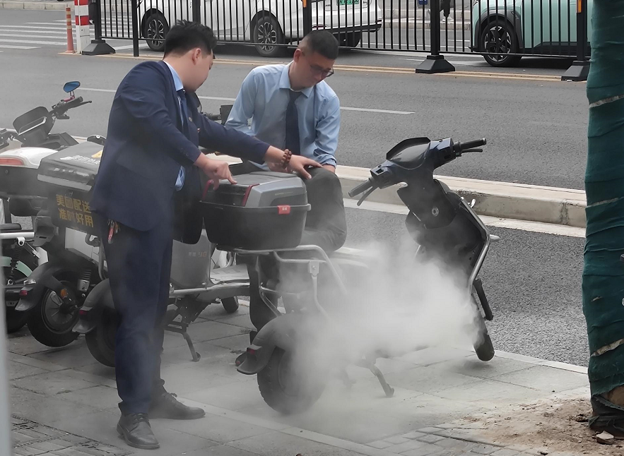 15时30分许,太平洋房屋房产经纪人谢帅鹏在门店外工作时,突然发现路边一辆电瓶车冒出浓烟,店长林嘉辉立即组织应急处置。事发地点位于交通要道,人流车流密集,若不及时控制火势,后果不堪设想。