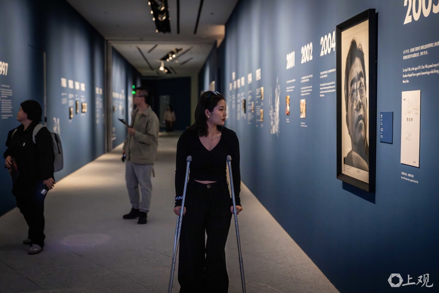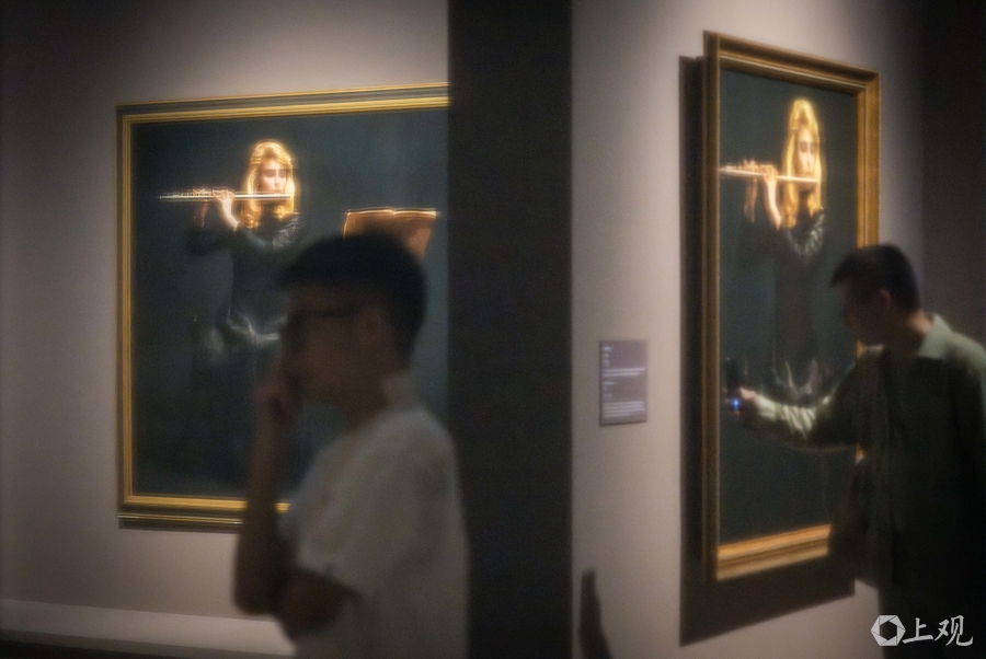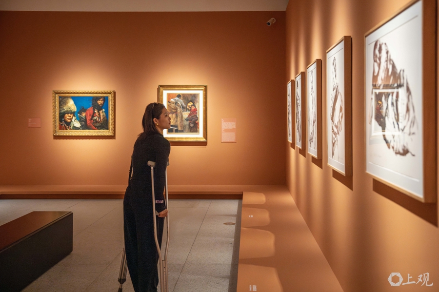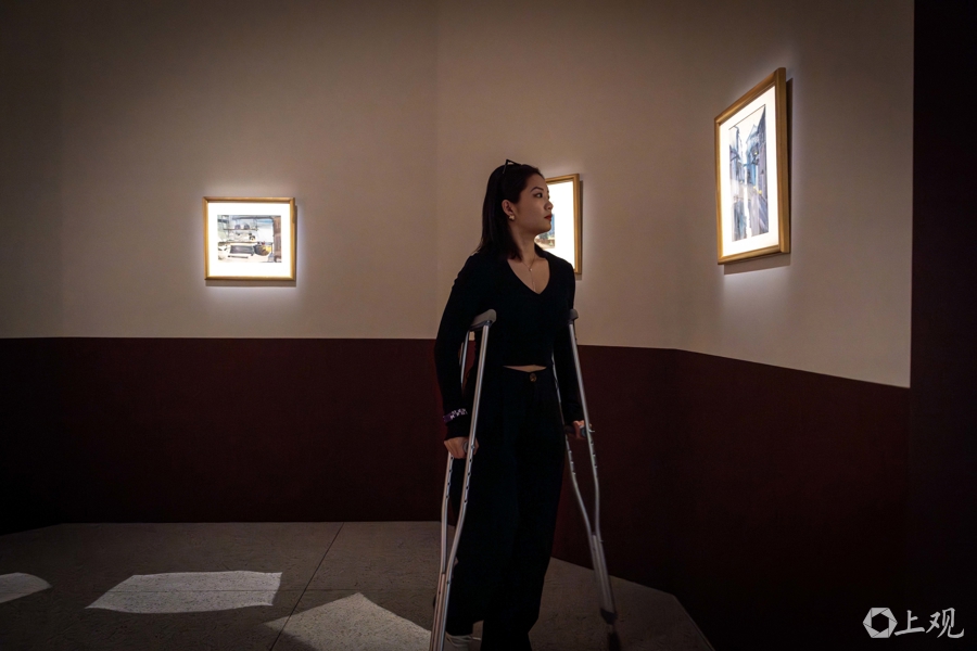 90后媒体人小张拄着拐杖仔细端详陈逸飞先生的每一幅画作,“腿受伤后,能不动就不动,但是陈逸飞先生的展览一定要来看看。”