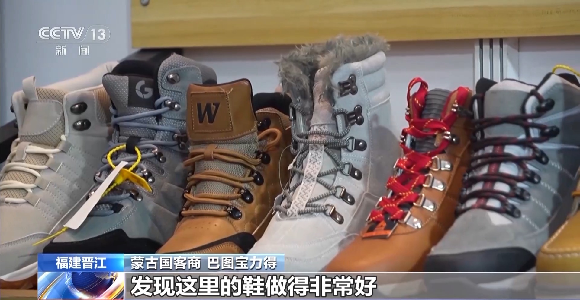 蒙古国客商 巴图宝力得:这里有好多科技方面的新产品、新设备,本来我们只是来考察的,发现这里的鞋做得非常好,适合我们蒙古国的天气,所以一看就订货了。