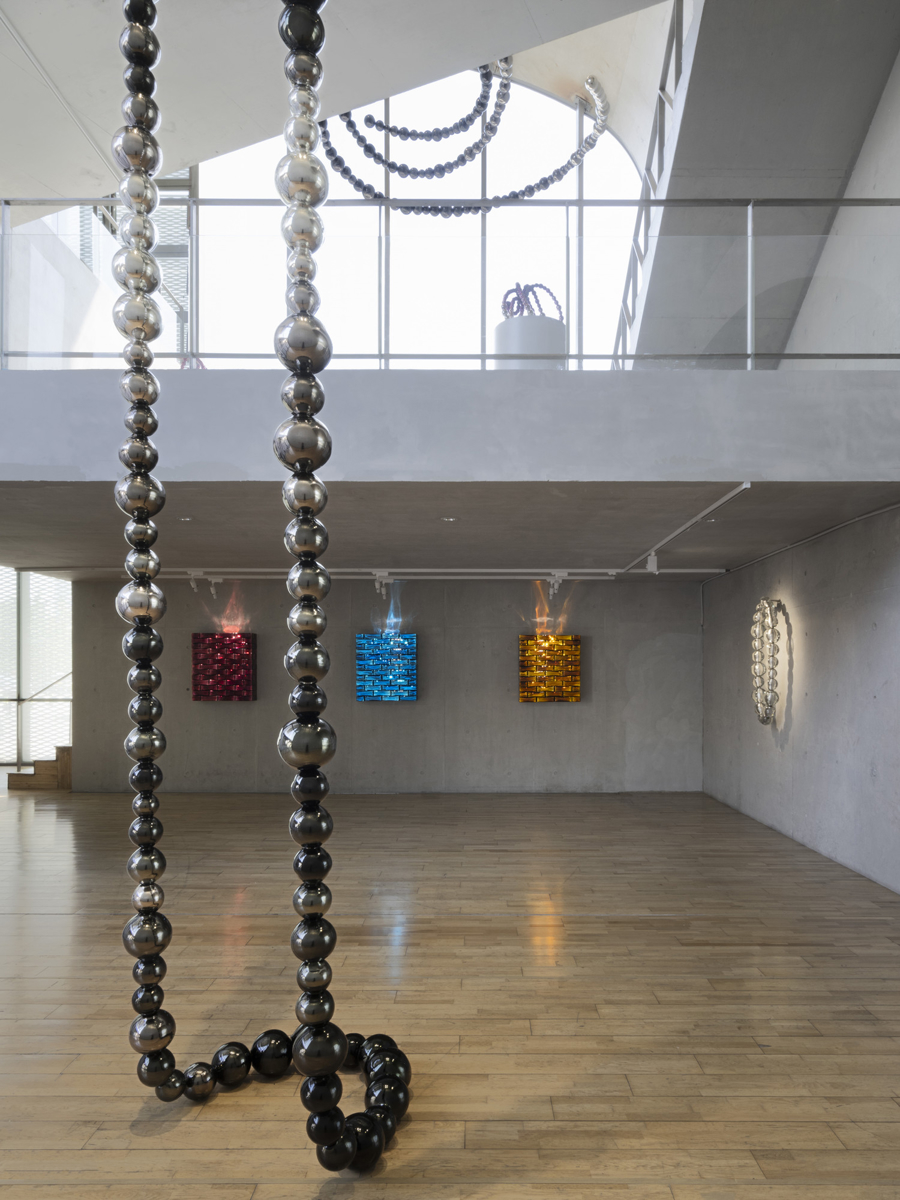 “太美了!”近日亮相龙美术馆西岸馆的法国艺术家尚-米歇尔·欧托尼耶在中国的首场美术馆个展“魔法”,让不少观众发出这样的感叹。展出的60多件作品,由形态各异的彩色玻璃珠串和砖块构成,大小不同,色彩斑斓,它们相互搭配和堆叠,在展馆西楼展厅独特的结构下与光影交汇,散发出光彩夺目、令人愉悦的色泽。